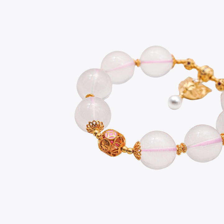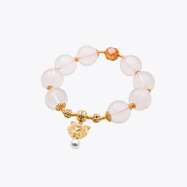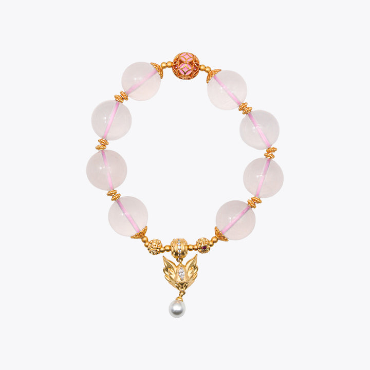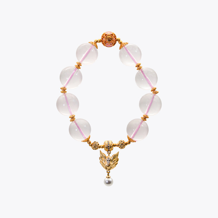 Materials: Golden Nine-Tailed Fox Charm (with CZ stone on forehead), Pearl-Luster Glass Beads, Mozambique Pink Crystal, Alloy Accents